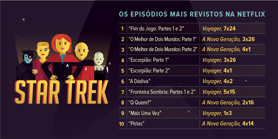 Computador: Quantos assinantes assistiram a todos os 695 episódios de Star Trek na Netflix? É melhor ajustar os feisers em tonteio, porque cerca de 12 mil fãs passaram cerca de 536 horas (ou 22 dias) assistindo a Star Trek. Os dados da Netflix também revelam que Voyager tem o episódio mais revisitado do universo: “Fim do jogo: Partes 1 e 2” (temporada 7, episódio 24) é o episódio mais revisto de todas as séries da franquia. Execute-se!
